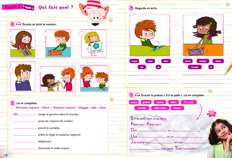- new verbs: gommer (to erase), dessiner (to draw), tailler (to sharpen), peindre (to paint), découper (to cut), coller (to glue), écrire (to write).